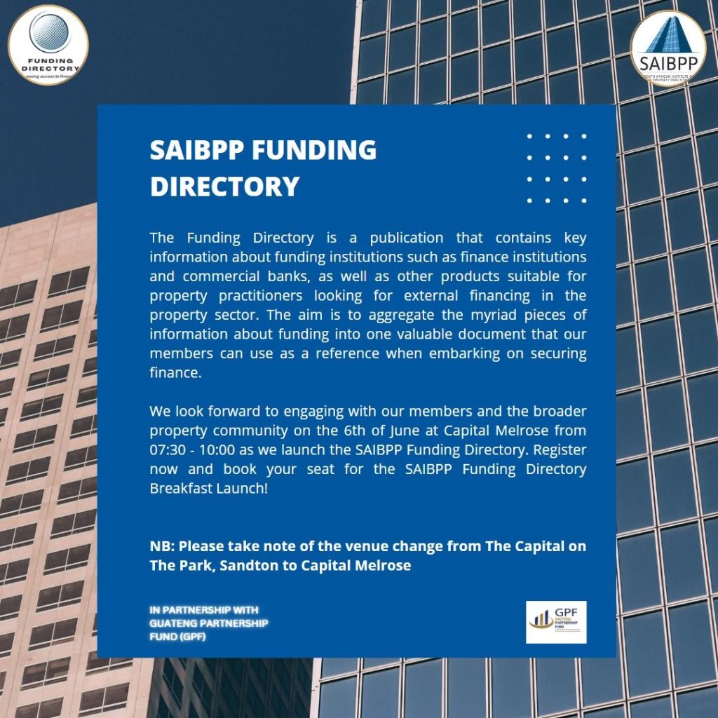 On 6 June 2023, the Gauteng Partnership Fund (GPF) partnered with the SA institute of Black Property Practitioners (SAIBPP) to launch the Funding Directory – a publication that contains key information about funding institutions such as finance institutions and commercial banks, as well as other products suitable for property practitioners looking for external financing in the property sector.